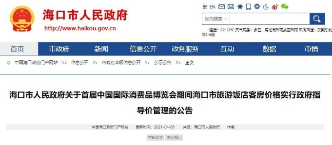 据海南省海口市人民政府官网发布的消息,为防止首届消博会期间海口市旅游饭店哄抬客房价格,海口市人民政府4月8日发布公告,决定在消博会期间对海口所有酒店客房价格实行政府指导价管理 。