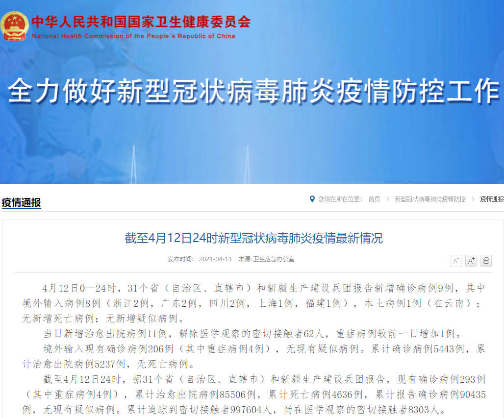 4月12日0—24时,31个省(自治区、直辖市)和新疆生产建设兵团报告新增确诊病例9例,其中境外输入病例8例(浙江2例,广东2例,四川2例,上海1例,福建1例),本土病例1例(在云南);无新增死亡病例;无新增疑似病例。