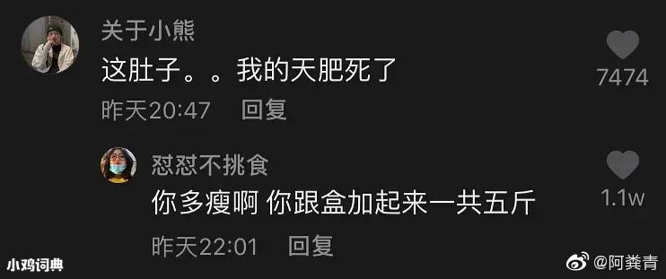 这个盒指的是骨灰盒。在一个小姐姐跳舞的视频底下,有键盘侠回复,“这肚子,肥死了”。于是有正义的人回复他,“你多瘦啊,你跟盒加起来一共5斤”。因为怼的巧妙,这不带脏话的骂人,引起了极度舒适。