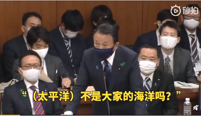 此前,日本副首相麻生太郎称“处理过的核废水喝了也没事”。对此,中国外交部发言人赵立坚称“太平洋不是日本的下水道,请他喝了再说”。16日,麻生太郎也做出回应称,“中国说‘太平洋不是日本的下水道’,难道太平洋是中国的下水道吗?太平洋难道不是大家的海洋吗?”此外,麻生太郎还强调,经过处理的核废水中放射性物质氚的含量达到世界卫生组织(WHO)饮用水标准,所以才说“可以喝”。
