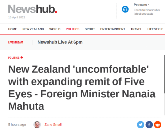 Newshub:新西兰外长马胡塔对扩大“五眼联盟”权限感到“不舒服”