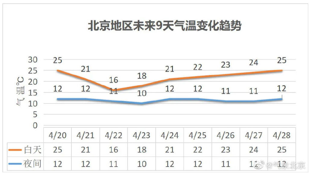 从20日开始,北京气温将连降三天,22日最高气温仅16℃。