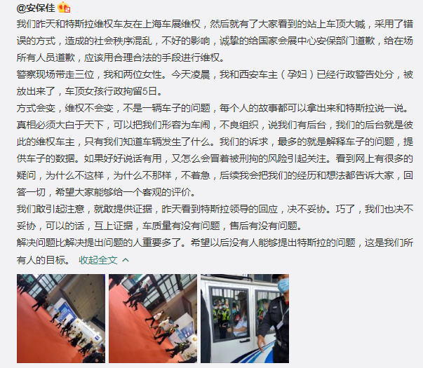 4月20日上午,参与特斯拉展台维权的一位当事人@安保佳发微博表示:我们昨天(4月19日)和特斯拉维权车友在上海车展维权,然后就有了大家看到的站上车顶大喊,采用了错误的方式,造成的社会秩序混乱,不好的影响,诚挚的给国家会展中心安保部门道歉,给在场所有人员道歉,应该用合理合法的手段进行维权。警察现场带走三位,我和两位女性。今天(4月20日)凌晨,我和西安车主(孕妇)已经行政警告处分,被放出来了,车顶女孩行政拘留5日。