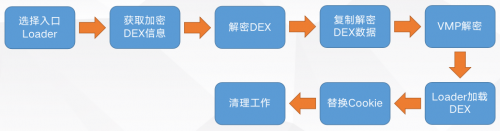 DEX加壳技术:基本原理是对原始的dex文件进行整体加密,隐藏dex文件源码,修改程序入口。运行时通过Dalvik虚拟机动态加载执行解密后的dex文件。具体流程如下: