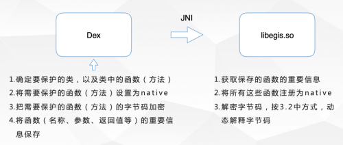 VMP保护技术:与传统的加壳工具不同,不是简单地对目标进行加密、压缩。而是修改目标源码,让目标的部分指令在VMP创建的虚拟环境下运行。首先对原始字节码进行加密处理,然后将函数(方法)替换为native属性,转到JNI层去执行,最后在JNI层将字节码解密,并解释执行。具体流程如下: