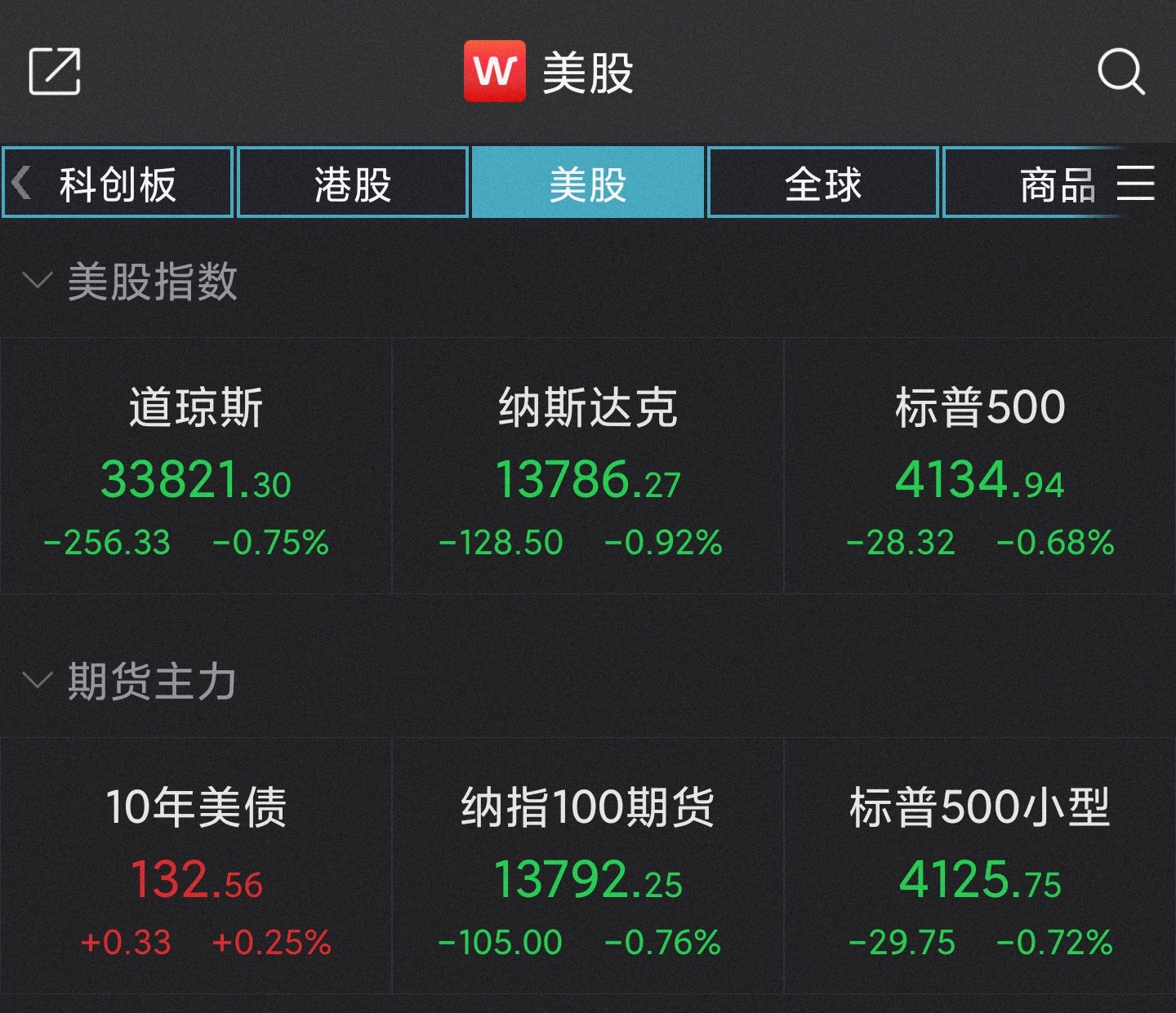 具体来看,截至收盘,道指跌256.33点,跌幅0.75%,报33821.30点;纳指跌128.50点,跌幅0.92%,报13786.27点;标普500指数跌28.32点,跌幅0.68%,报4134.94点。