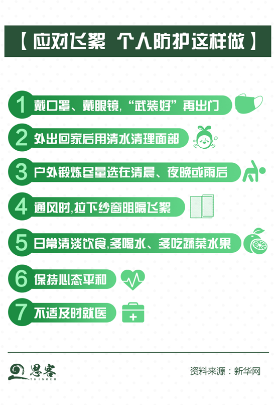 【防飞絮小贴士】外出时,口罩、眼镜和外套一样都不能少,全副“武装”再出门。如果有“毛毛”不慎钻到眼睛里,可及时用清水冲洗,切记别用手搓揉,否则很容易划破角膜,增加感染几率,症状严重的话,要及时就医。当然,大家还要注意消防安全,不要乱扔烟头,谨防引燃飞絮引发事故。