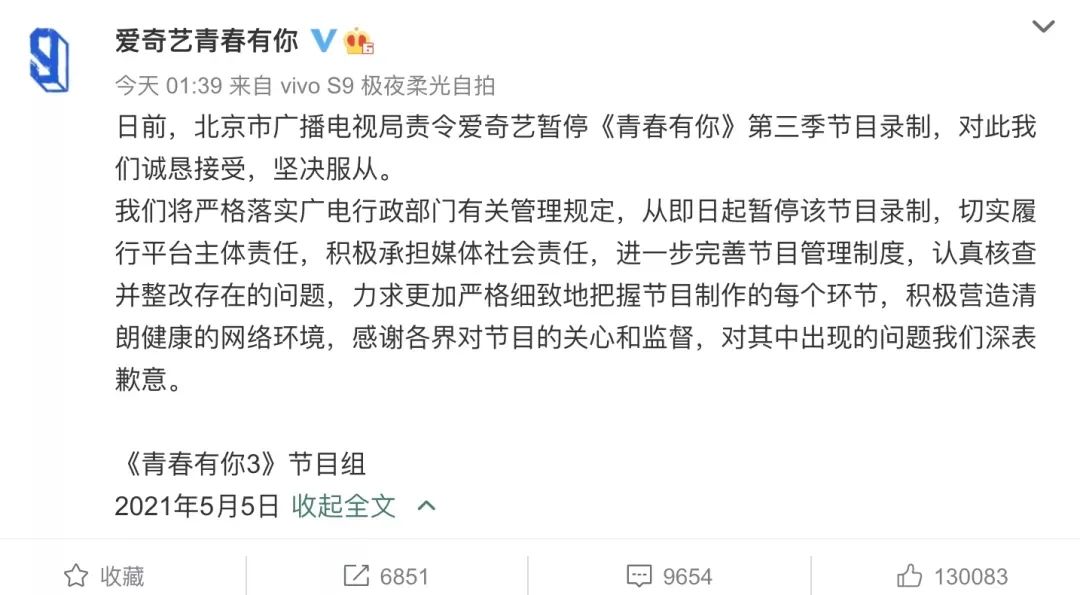 北京市广播电视局现责令爱奇艺停息《青春有你》第三季候目录制
