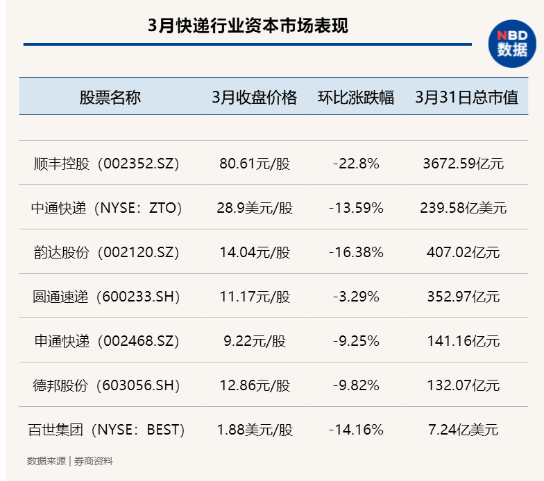 然则随即全部快递行业股价在3月集体陷入低迷。