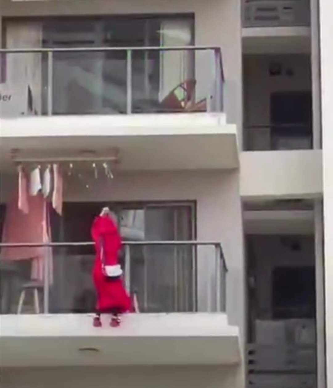 女子站在阳台的栏杆外解释:“没事的