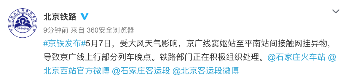 导致京广线上行部分列车晚点。铁路部门正在积极组织处置惩罚。