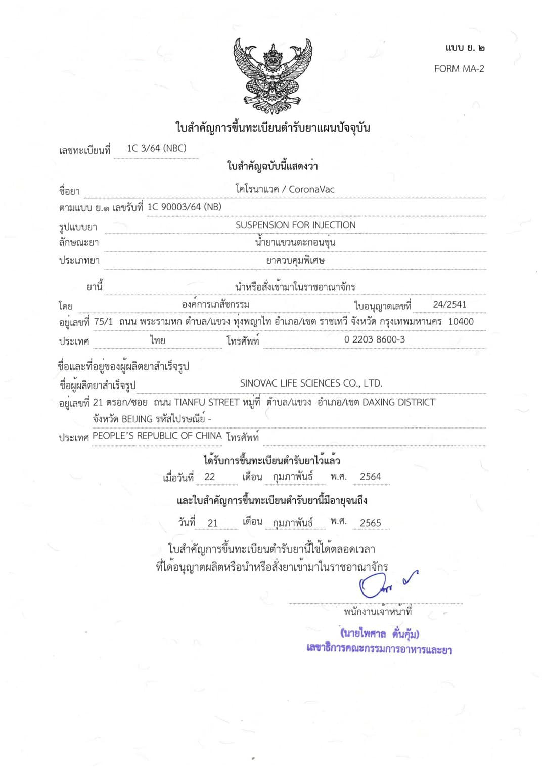当地时间2月22日,泰国卫生部食品与药品委员会秘书长派衫签发中国科兴新冠疫苗注册文件,标志着科兴疫苗完成在泰合法注册,可以为泰国民众进行接种。(该文件的有效期为1年,自2021年2月22日至2022年2月21日。)