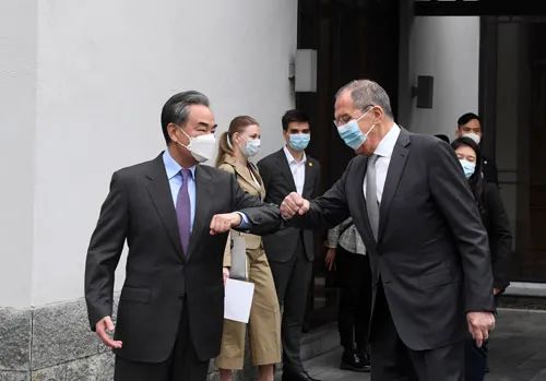 外交部网站还发布了王毅和拉夫罗夫“碰肘”的照片。