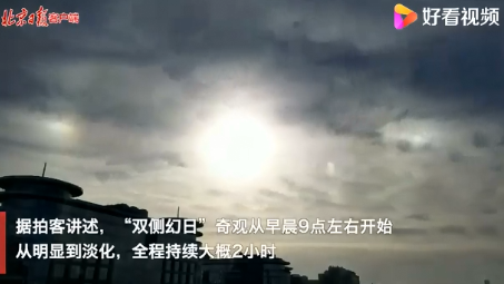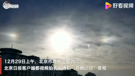 12月29日上午,北京市西城区宣武门,北京日报客户端都视频拍客拍摄到“双侧幻日”奇观。据拍客讲述,“双侧幻日”奇观从早晨9点左右开始,从明显到淡化,全程持续大概2小时。