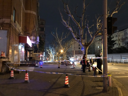 澎湃新闻记者在当晚现场看到,天申综合大楼就在马路边上,现场自天申综合小区南门到茅台路威宁路路口,拉起了约5米宽、20余米长的警戒线,掉落的碎片已被扫到马路边沿,有4名保安值守当场。