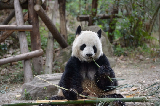 近日,成都大熊猫繁育研究基地里的大熊猫们在春日里悠哉地吃竹子,萌态十足惹人爱。