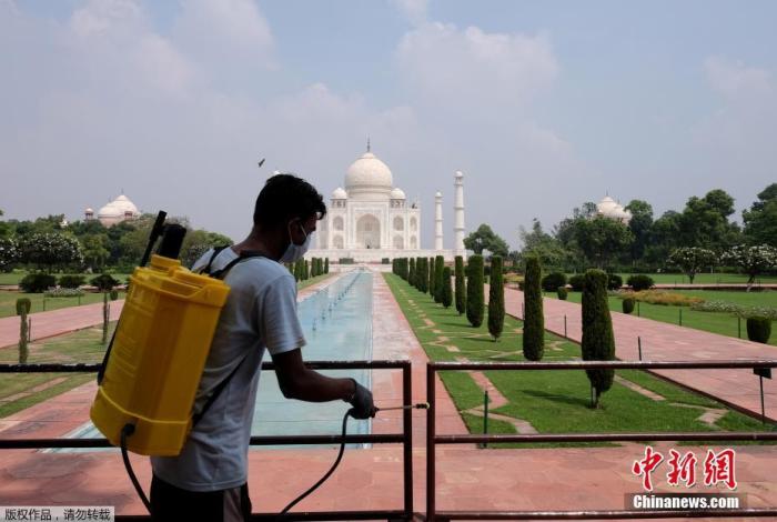 资料图:当地时间2020年9月21日,印度泰姬陵重新对外开放。图为工作人员对栏杆进行消毒。