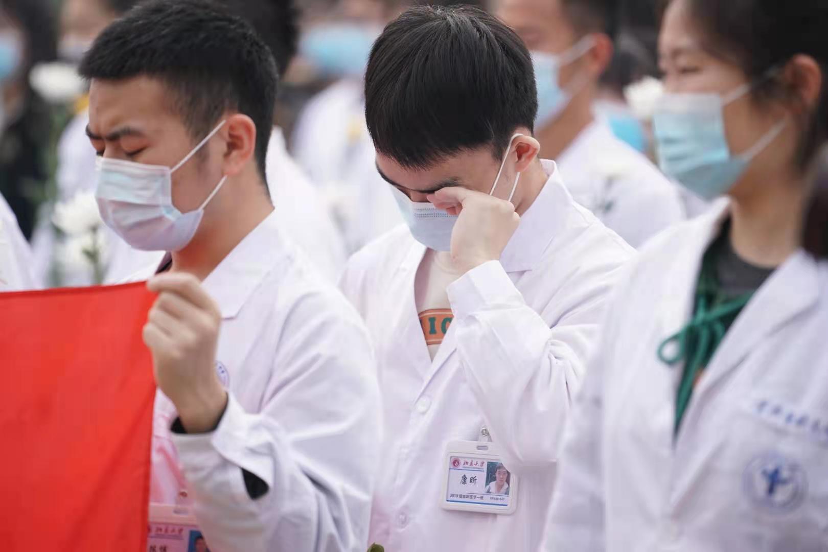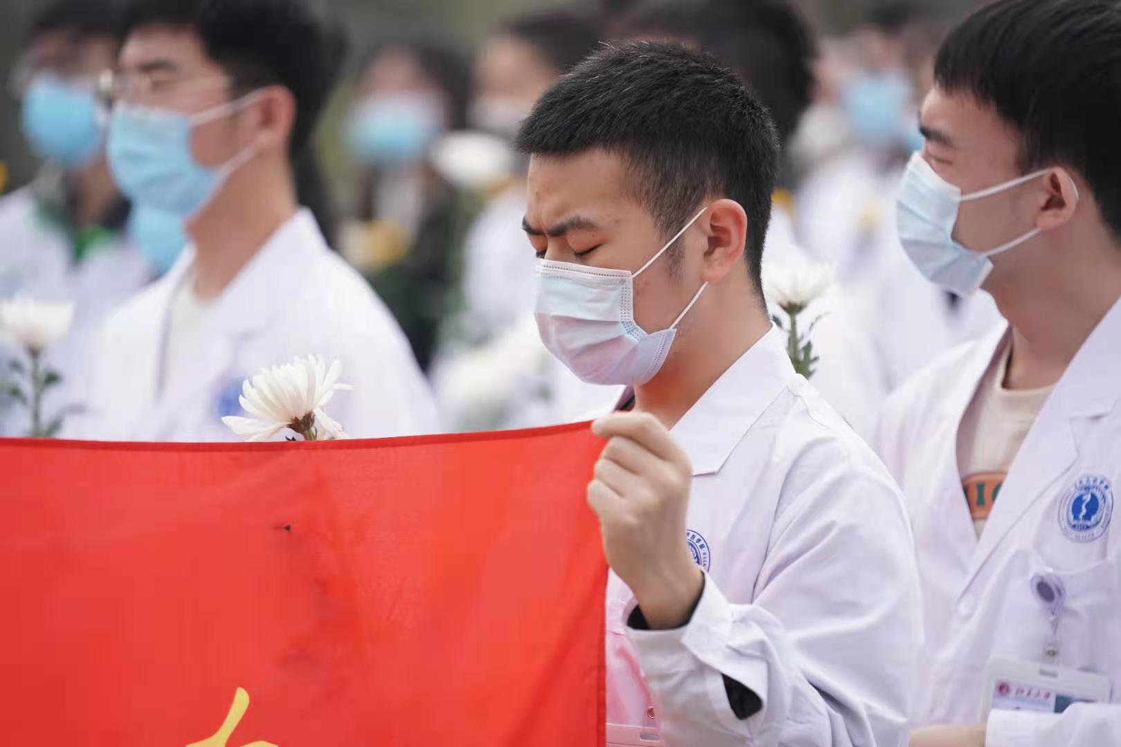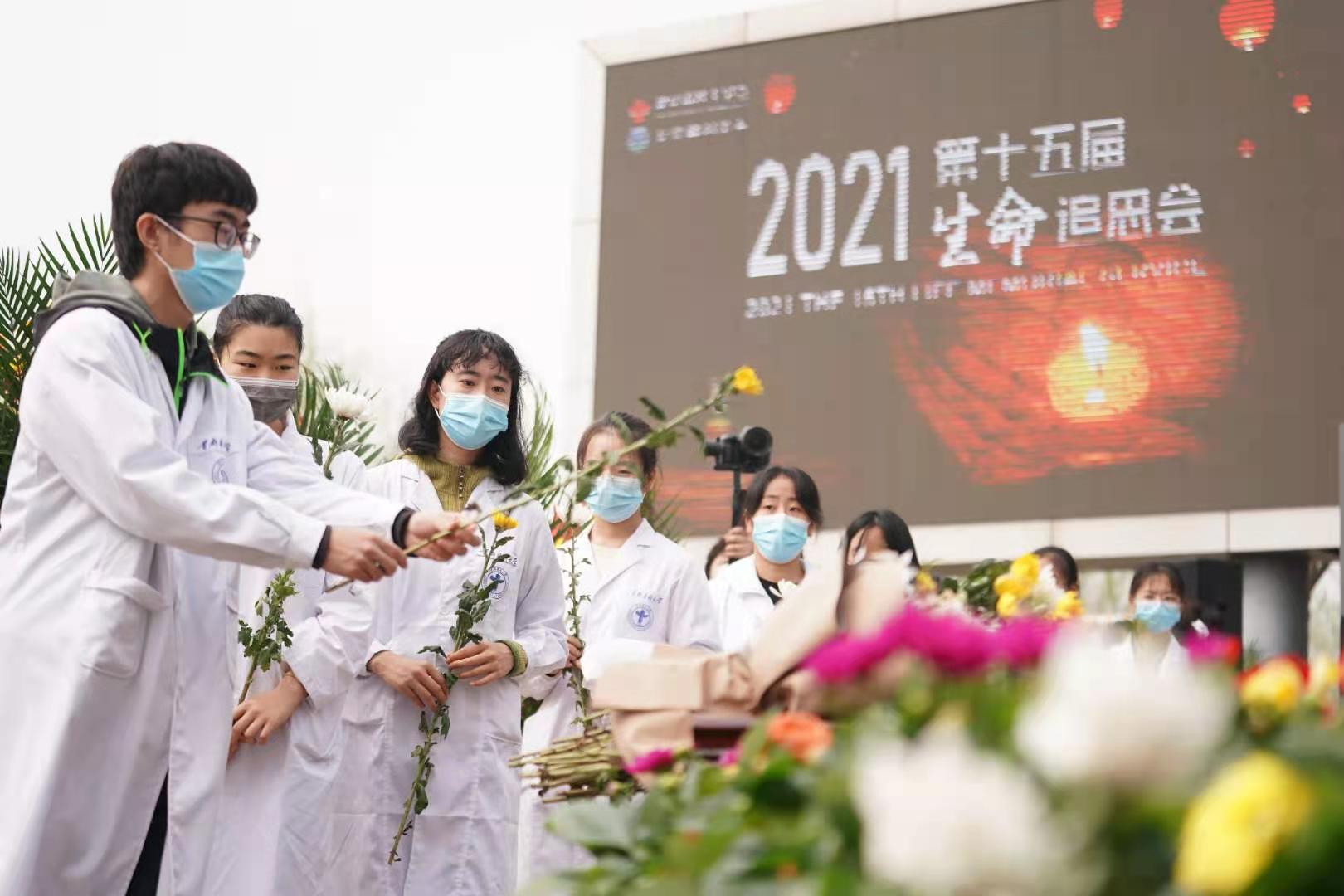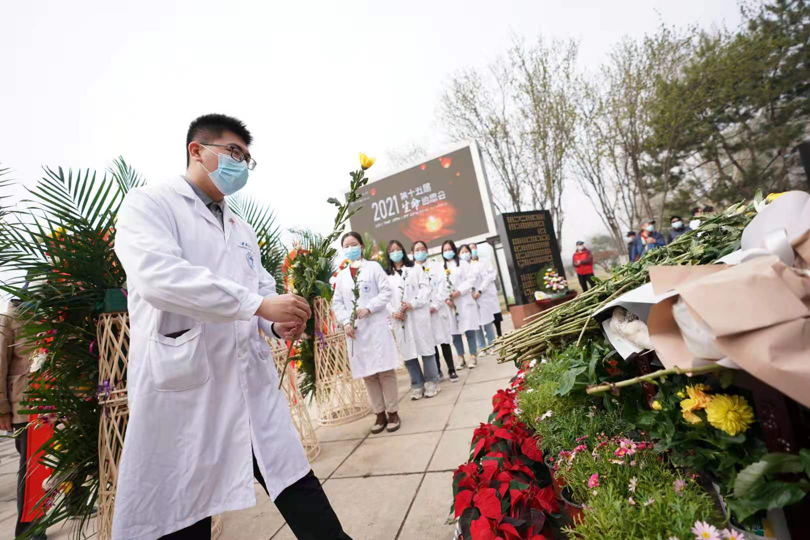 生命纪念碑前,北京协和医学院、北京大学医学部、首都医科大学师生和北京市红十字会志愿者、捐献者家属代表等150余人手捧寄托无限哀思的黄色、白色菊花,神情凝重,面向纪念碑,肃立、默哀。