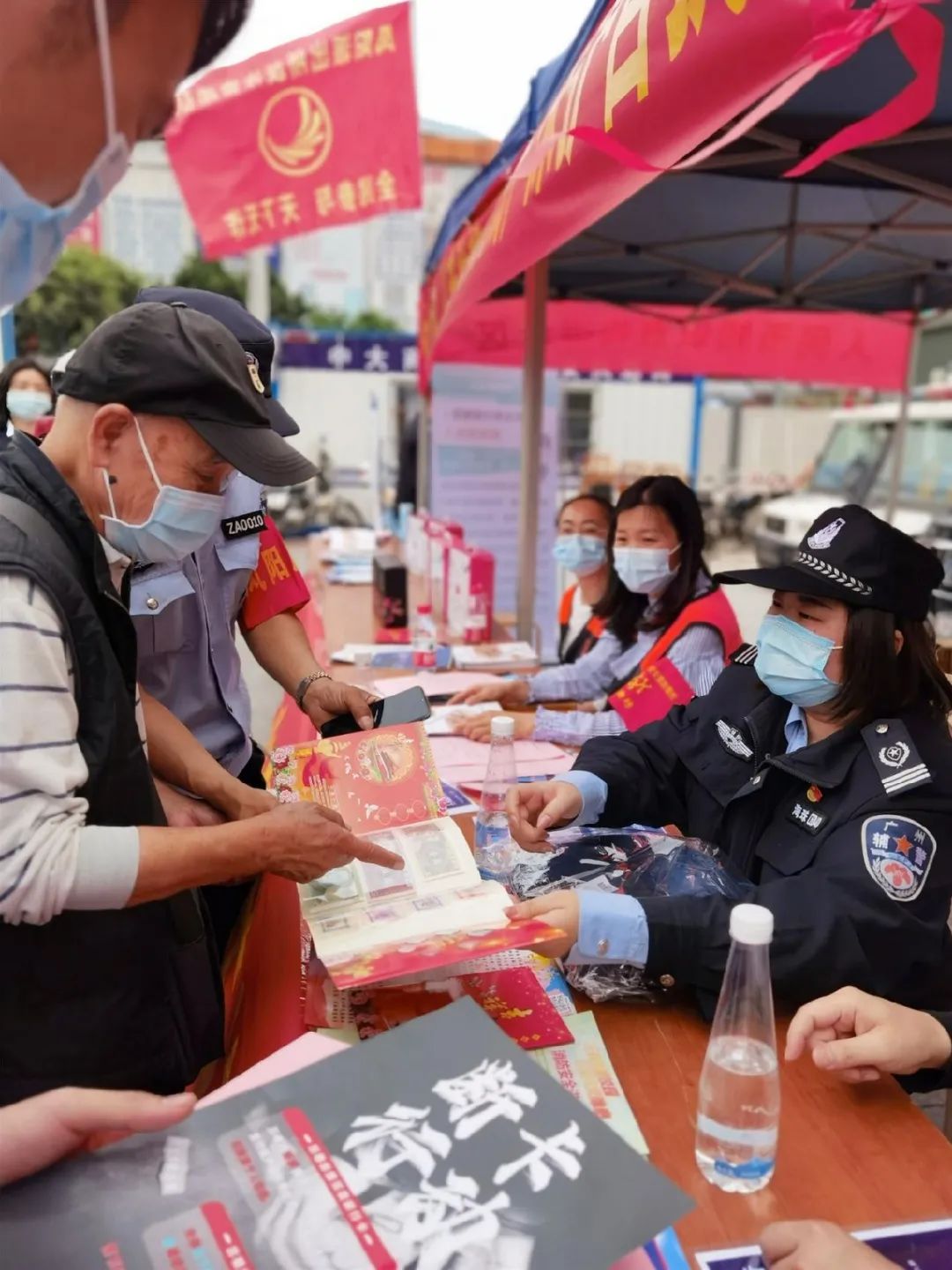 为进一步打击治理网络新型违法犯罪,提高群众自我防范意识,保障人民群众财产安全。3月25日下午,海珠区公安分局凤阳派出所联合中国农业银行广州城南支行、凤阳街平安促进会、凤阳街道禁毒办、海珠区禁毒社工项目“启帆之家”等社会各方力量在海珠区纯阳观前广场,共同开展了“平安共建进村社,反诈断卡齐行动”主题宣传活动。
