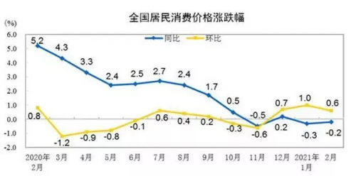 国内方面,3月10日,国家统计局网站发布了2021年2月份全国CPI(居民消费价格指数)和PPI(工业生产者出厂价格指数)数据,2月份,CPI环比上涨0.6%。其中,城市上涨0.6%,农村上涨0.4%;食品价格上涨1.6%,非食品价格上涨0.4%;消费品价格上涨0.7%,服务价格上涨0.4%。(*数据来源:中国网财经)
