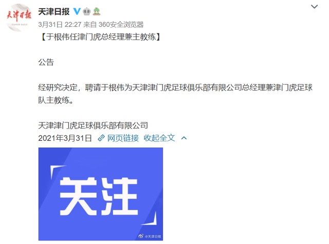 天津津门虎足球俱乐部3月31日晚发布公告,宣布聘请于根伟为俱乐部总经理兼球队主教练。