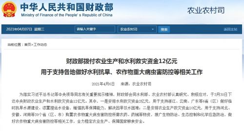 星岛环球网消息:中国网4月7日讯 据财政部网站消息,财政部会同水利部、农业农村部认真研究、积极应对,于3月30日下达中央财政农业生产和水利救灾资金12亿元,用于支持各地做好水利抗旱、农作物重大病虫害防控等相关工作。